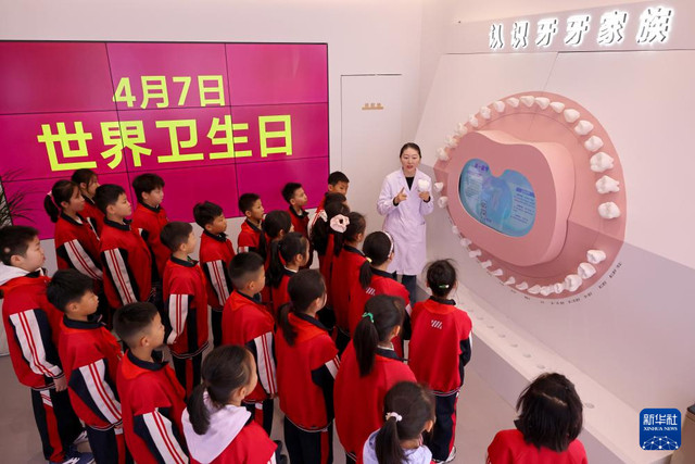 4月7日,在山东省枣庄市口腔科普馆,医务人员为前来参观学习的小学生们普及牙齿健康知识。4月7日是世界卫生日,国家卫生健康委将今年中国宣传主题确定为“共享科技创新,携手共促健康”。新华社发(孙中喆摄)