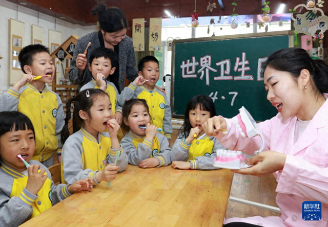 4月7日,湖北省武汉市江岸区快乐天使幼儿园老师为小朋友们示范正确的刷牙方式。4月7日是世界卫生日,国家卫生健康委将今年中国宣传主题确定为“共享科技创新,携手共促健康”。新华社发(赵军摄)