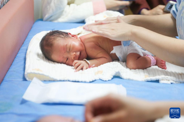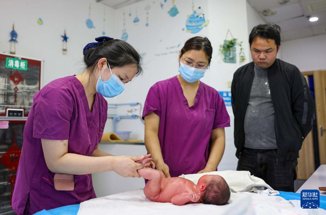 4月7日,在贵州省铜仁市玉屏侗族自治县人民医院产科,医护人员为新生儿家属传授按摩技术。4月7日是世界卫生日,国家卫生健康委将今年中国宣传主题确定为“共享科技创新,携手共促健康”。新华社发(胡攀学摄)