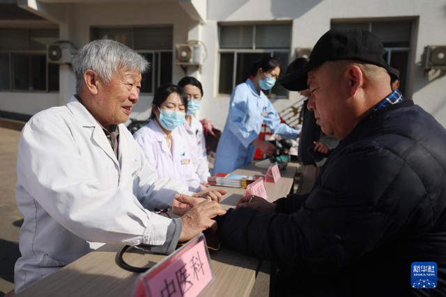 4月7日,在山东省临沂市沂南县中医医院,医务人员为群众义诊。4月7日是世界卫生日,国家卫生健康委将今年中国宣传主题确定为“共享科技创新,携手共促健康”。新华社发(王彦冰摄)